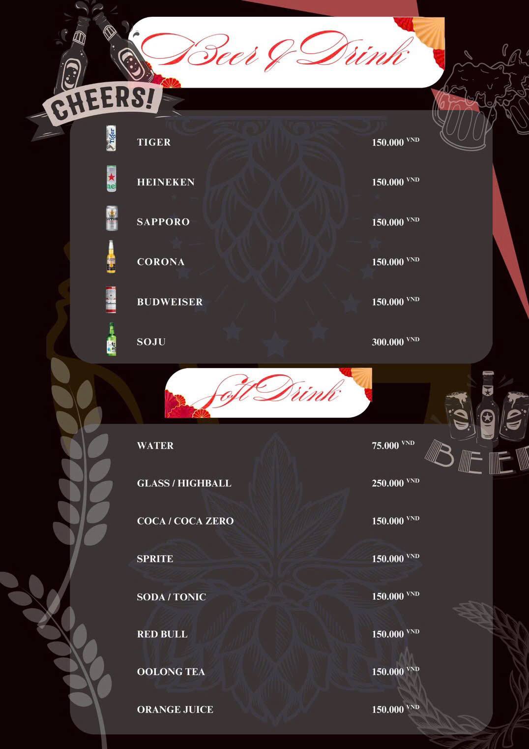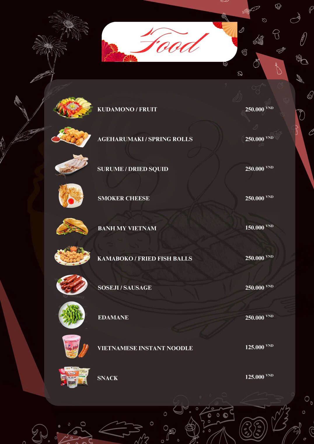 Snacks are available: spring rolls, dried squid, cheese, sausages, edamame, etc.