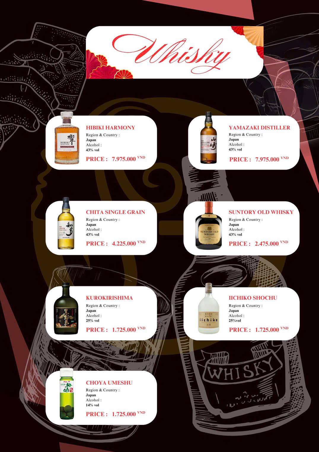 Big whisky lineup: classic Scotch and bourbon plus a strong selection of Japanese bottles (Hibiki, Yamazaki, Chita, Suntory Old, etc.).